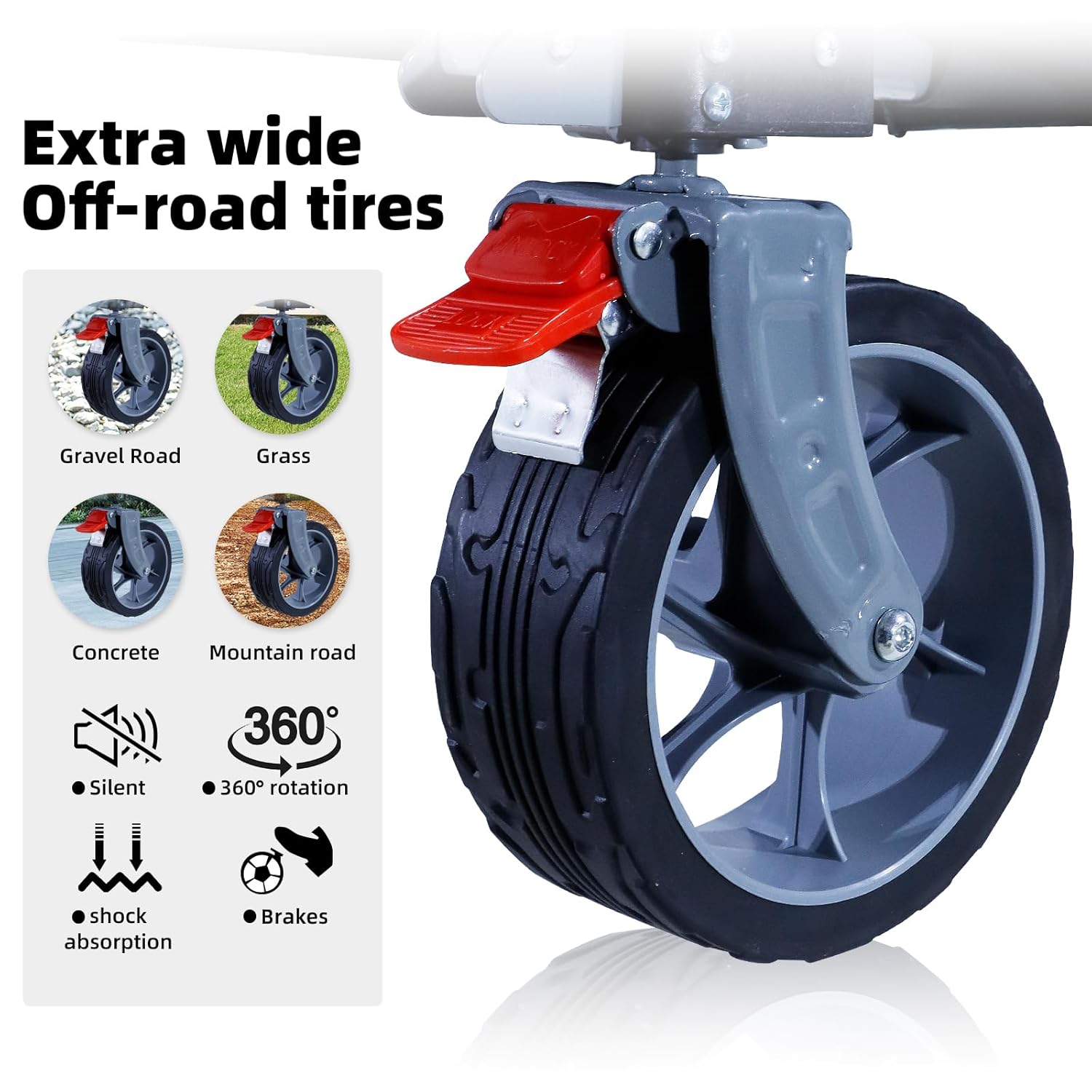 - Breite, dicke Reifen mit 360°-Schwenkfunktion: Verschleißfest und terrainadaptiv, für reibungsloses Fahren auf verschiedenen Böden.