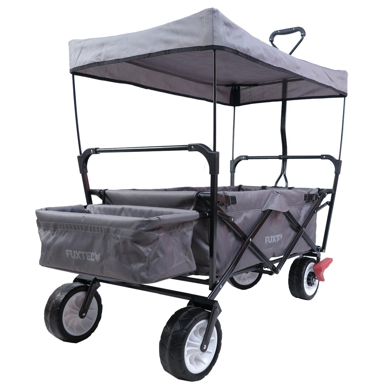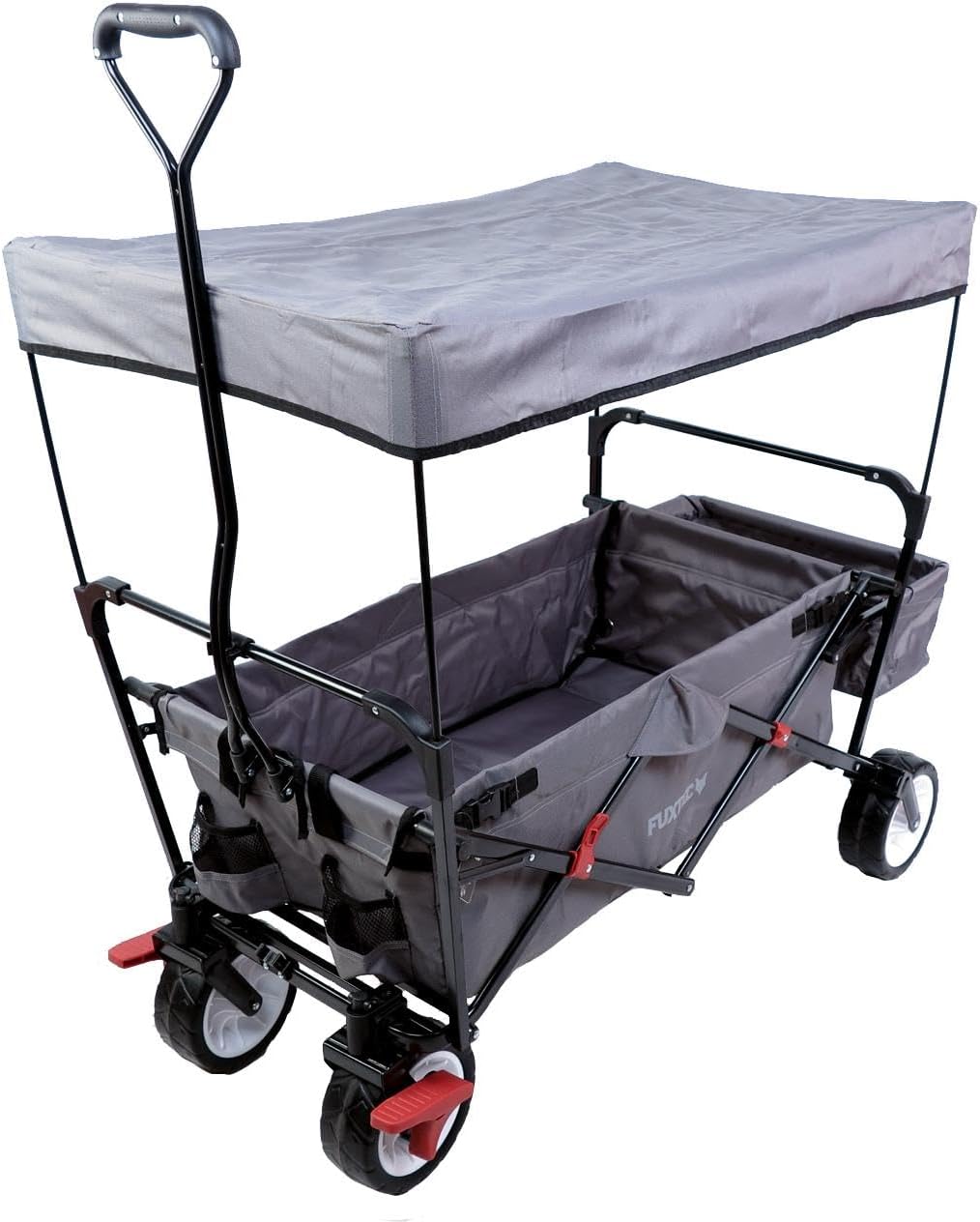 Wir haben den FUXTEC Faltbaren Bollerwagen FX-CT350 in Lila mit Dach für Festivals getestet und sind begeistert. Die Reifen sind hervorragend und lassen sich leicht führen, selbst auf unebenem Gelände.