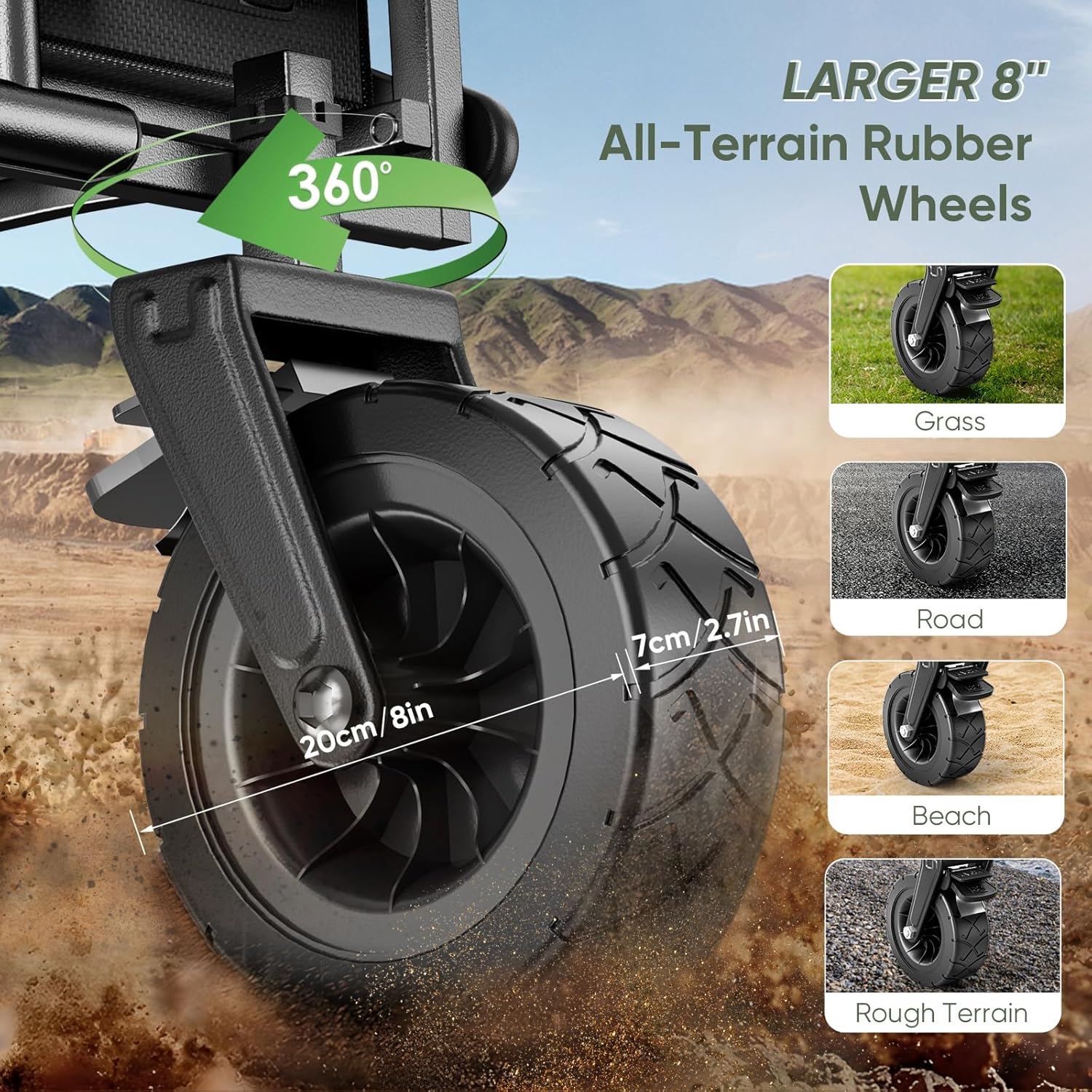- Vier 8-Zoll-All-Terrain-Gummiräder: Robuste Traktion auf jedem Boden, mit 360-Grad-Drehung vorne für agile Manöver.