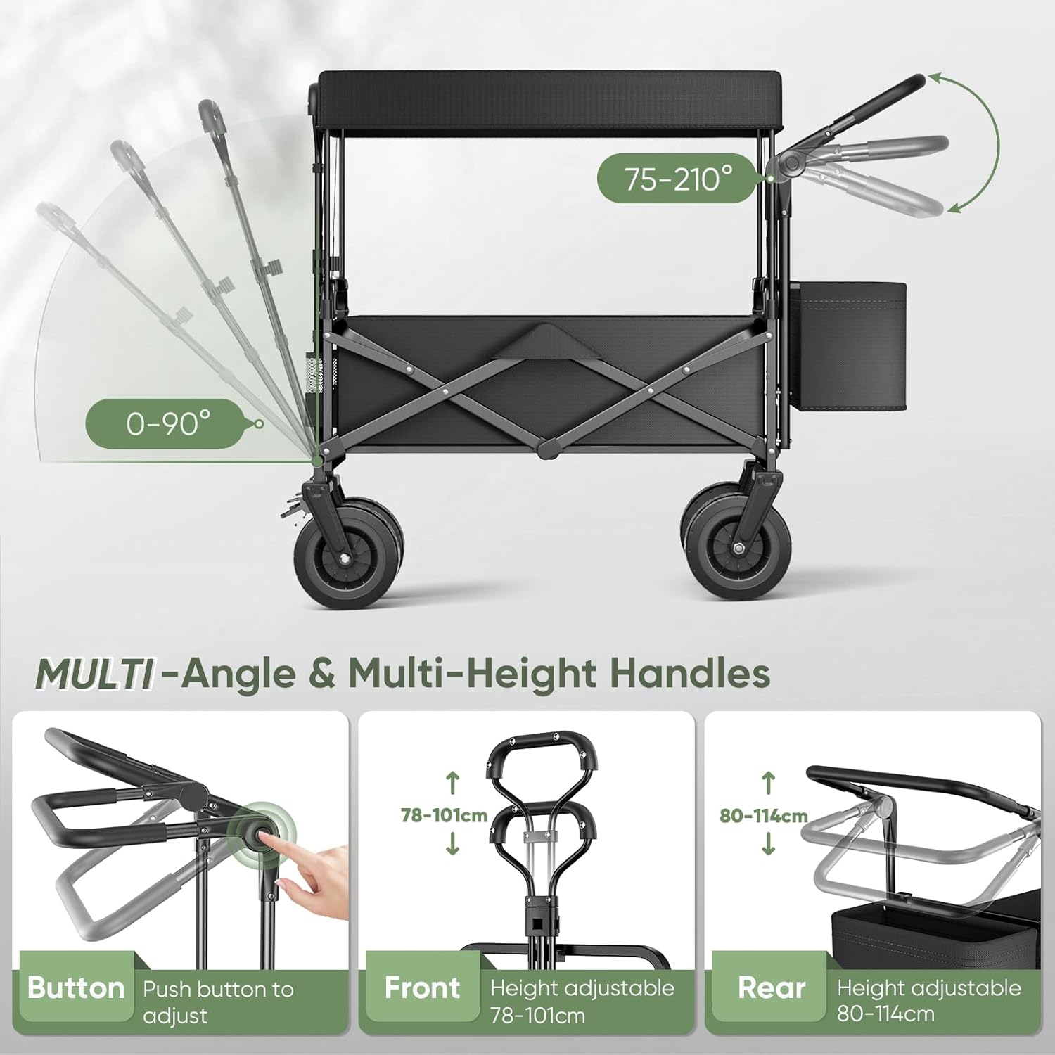 Der Komfort beginnt mit den verstellbaren Griffen, die an Vorder- und Rückseite angebracht sind und sich individuell anpassen lassen. Der Vordergreif ermöglicht eine Neigung von 0 bis 90 Grad und eine Höhenverstellung von 78 bis 101 Zentimetern, was ihn perfekt für kleinere Statur macht – ideal für Mütter, die den Karren mit einer Hand lenken, während sie das Kind halten. Der Hintergreif bietet eine Winkelspanne von 75 bis 210 Grad und Höhen von 80 bis 114 Zentimetern, sodass Väter oder Großväter bequem ziehen können, ohne Rückenschmerzen.