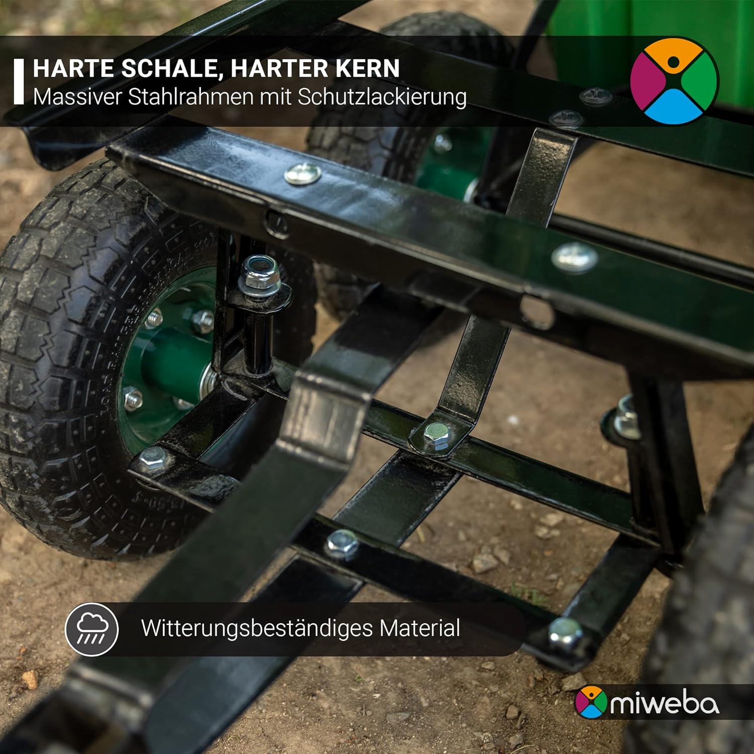 Der Miweba Handcart Dumper ist für den Außeneinsatz konzipiert, mit wetterbeständigen Materialien, die Feuchtigkeit, UV-Strahlung und Temperaturschwankungen trotzen. Der lackierte Stahlrahmen widersteht Rostbildung, selbst nach Regenfällen im Herbstgarten, und behält sein glänzendes Finish bei. Polypropylen-Komponenten sind UV-stabilisiert, um Verfärbungen zu vermeiden und die Integrität langfristig zu wahren.