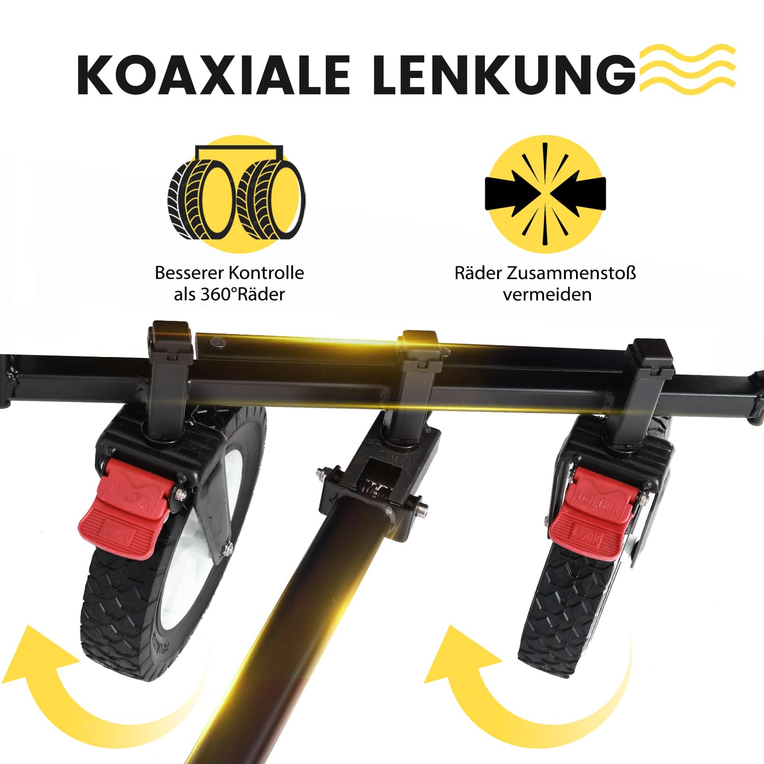 - Spezielle Merkmale: Koaxiale Lenkung mit 360°-Rolle, verstellbarer Griff, doppelte Rohrwand, solide Gummireifen